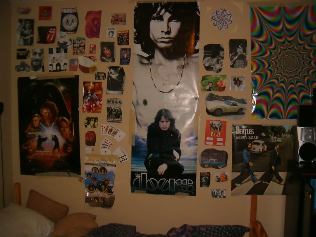walking upstairs into my room you turn a corner and it's about 2.5 times longer than it is wide with all white walls and a little hallway leading thru right next to my stairs (and on the other side of the walkway my closet) into my main room which is a rectangle with a shelving unit coming out of the wall on the right side with an abbey road poster to the right when you first walk in. on the facing wall there is a sgt peper poster and my bed is in that corner. ya know itl just be eiser to draw a picture... *edit*